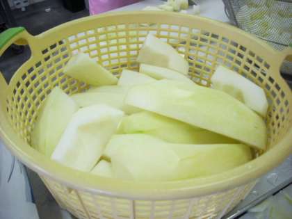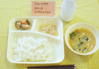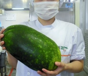 今日の献立は、「さけのつけ焼き、みそ汁、とうがんの煮もの、ごはん、牛乳」です。 冬瓜は夏が旬の野菜ですが、皮が厚いので冬まで保存できることから、冬瓜とよばれています。 今日は5個の冬瓜を、皮を厚くむいて種を取り、さっとゆでて、だし汁で煮ました。 子どもたちの感想は「おいしい!」と、「くにゃっとしていや」の両方でした。