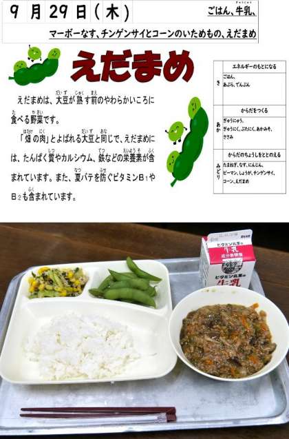 今日の献立は、マーボなす、チンゲンサイとコーンの炒め物、えだまめ、ごはん、牛乳でした。