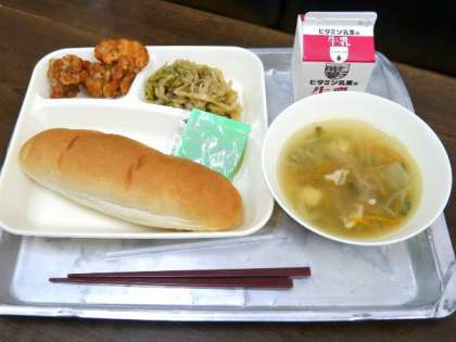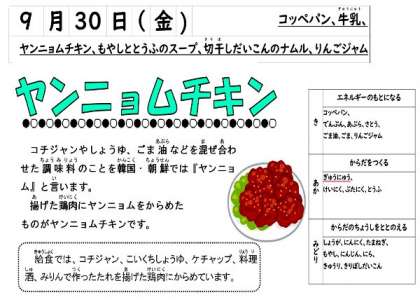 今日の献立は、ヤンニョムチキン、もやしととうふのスープ、切干しだいこんのナムル、りんごジャム、コッペパン、牛乳でした。