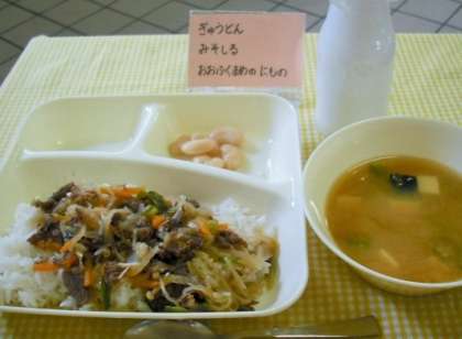 今日の献立は、「牛丼、みそ汁、大福豆の煮もの、牛乳」です。 大福豆はいんげん豆の仲間で、白くて粒が大きいのが特徴です。煮豆のほか甘納豆にも使われるおいしい豆です。給食室で、熱湯に30分間ひたした後、砂糖、塩、うす口しょうゆで味付けし、焼き物機で90分間煮ると、柔らかい豆に仕上がりました。