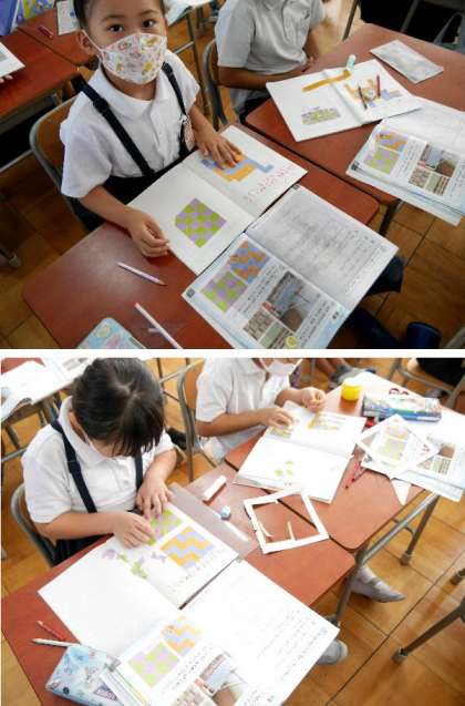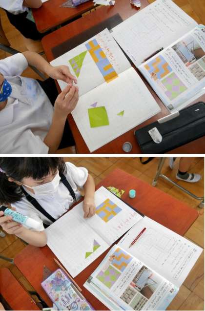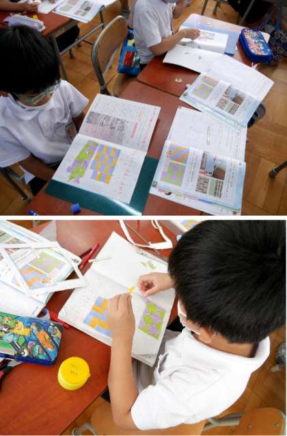 教科書にあるカードを切り取って、長方形や直角三角形をしきつめて模様を作ります。ノートにはきれいな模様ができましたね。