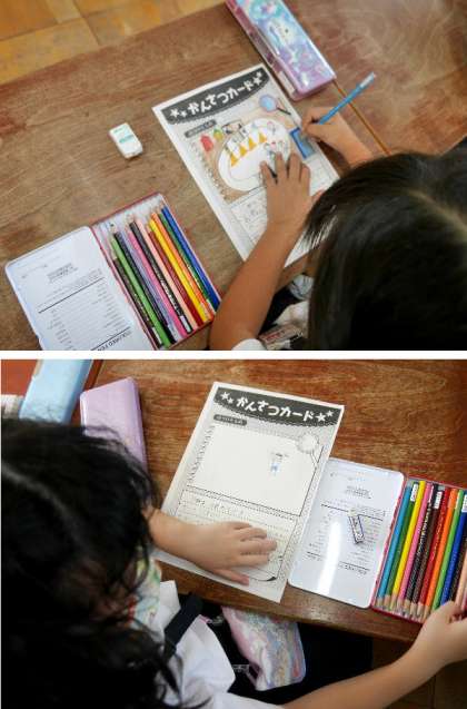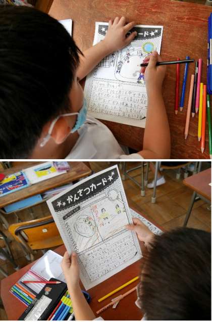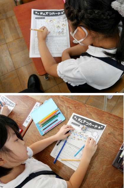 1年生が運動会をふりかえって、かんさつカードに書き込んでいます。ダンスが上手におどれた。楽しかったなど、うれしかったことや、がんばったことを書いています。