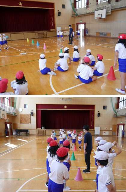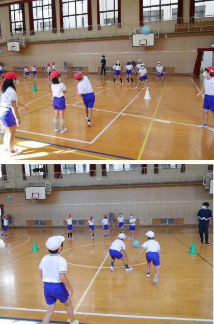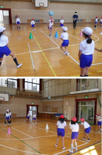 3年生の体育です。ポールを使ったゲームをみんなで行っています。