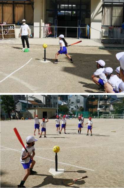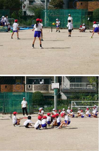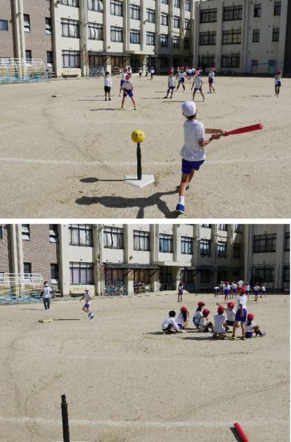運動場で、3年生がボールをバットでうつゲームをしています。みんなで楽しくできるるルールを守って運動しています。