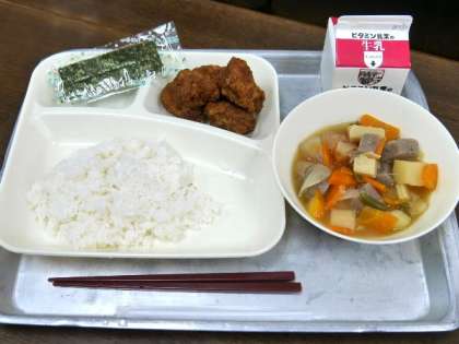 今日の献立は、みそカツ、じゃがいもと野菜の煮物、焼きのり、ごはん、牛乳でした。