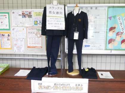 玄関に、今日から、長ズボンの見本展示を行っています。標準服の多様性や、寒暖差の大きい気候、選択の幅を広げる観点から、今年から長ズボンの着用も認めていくこととといたしました。あくまで、強制ではなく希望される方のみとなります。