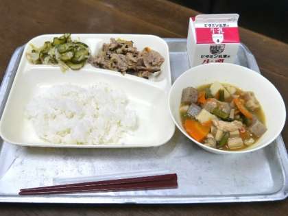 今日の献立は、豚肉のねぎじょうゆ焼き、ふきよせ煮、きゅうりともやしの甘酢あえ、ごはん、牛乳でした。