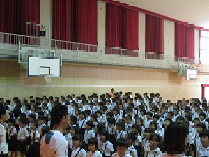 明日は臨時休校の可能性があるので、明日する予定の終業式を、児童集会に続けて行いました。
