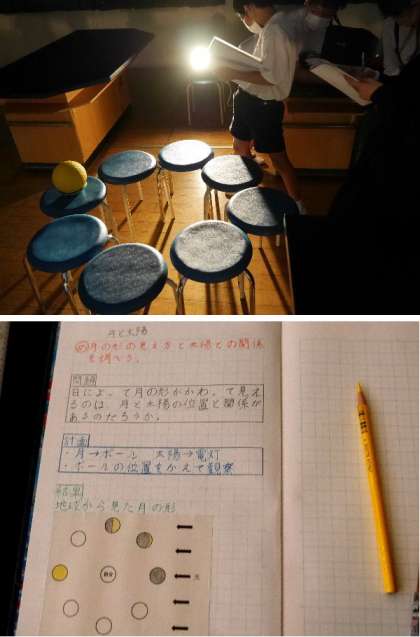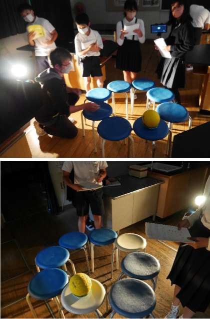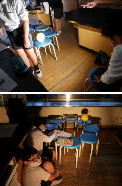 6年生が理科室で、教室を真っ暗にして実験していました。ボールを月として懐中電灯で照らして、月の見え方を観察していました。