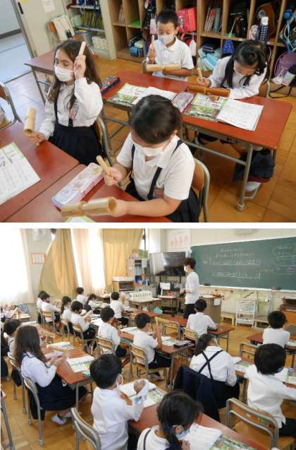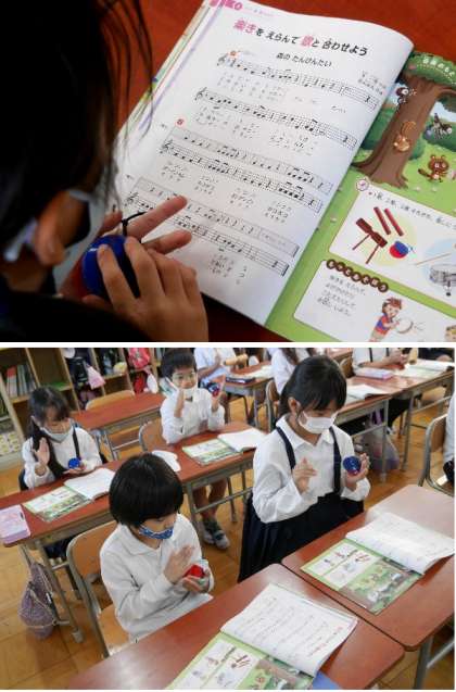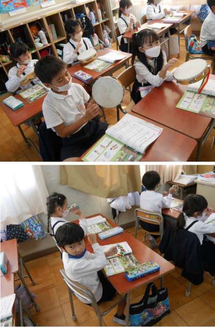 2年生が、タンバリンやカスタネットなどをもって、歌にあわせてリズムをきざみます。
