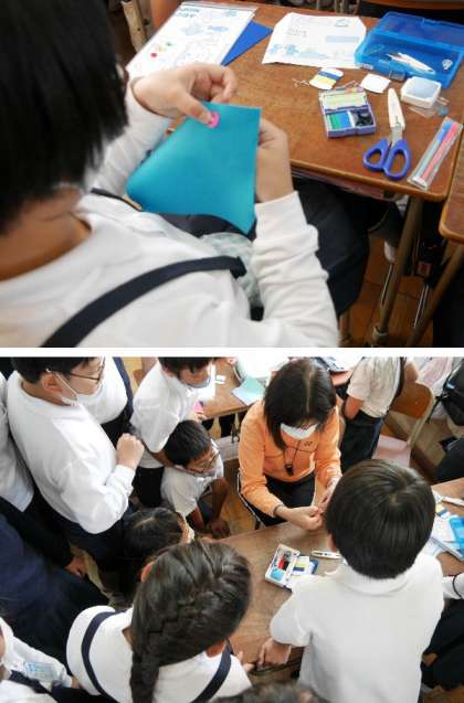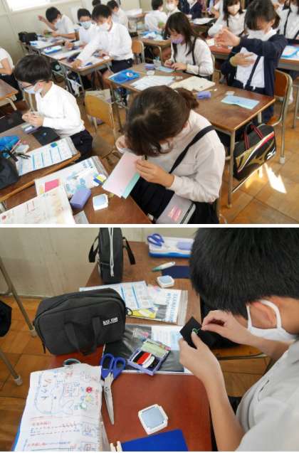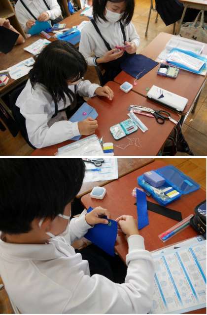 5年生の家庭科では、フエルト生地で小物入れを作っています。今まで学習してきた針と糸をつかって、今日はボタンをつけました。