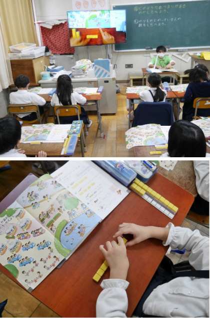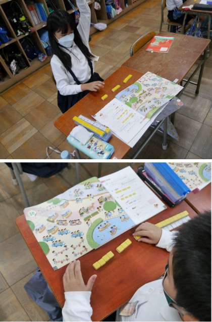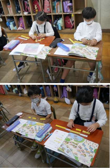 2年生の算数では、ブロックを使って、教科書の絵をみて、どんな集まりがあるか調べています。ボートに乗っている人を数えてブロックでおいています。