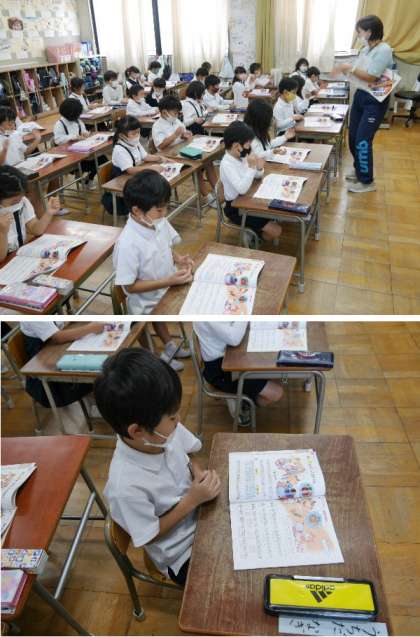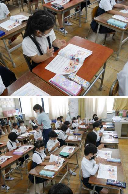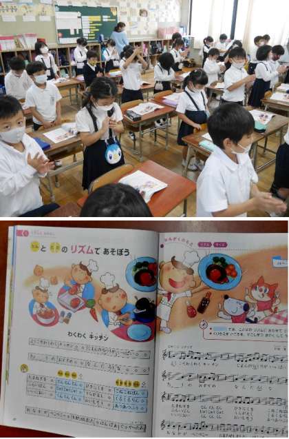 1年生の音楽では、「わくわくキッチン」という曲にあわせて、手拍子で「たん」と「た・た」のリズムであわせてうちます。