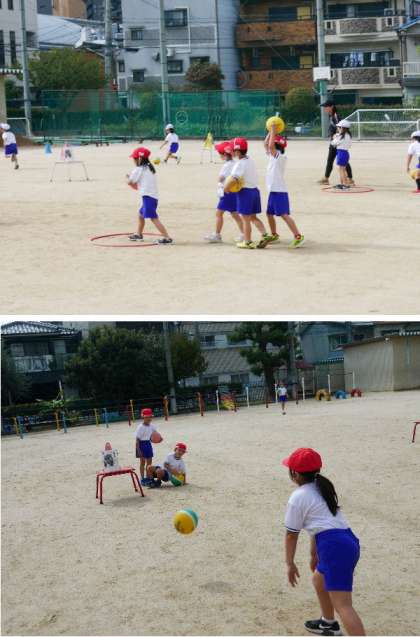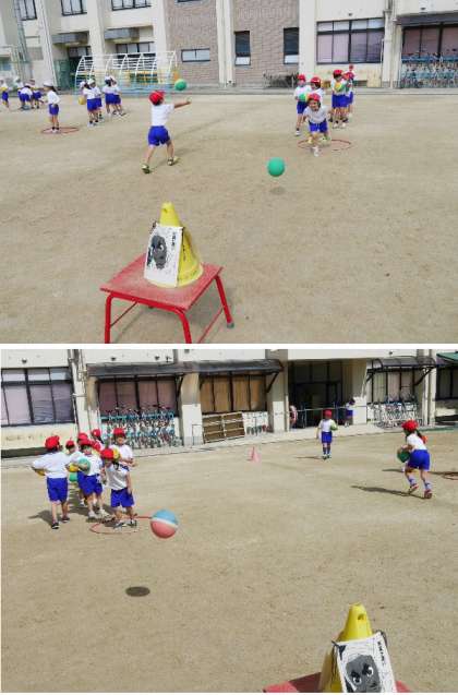 1年生の体育では、ボールを投げる練習をしていました。まとにめがけてしっかりなげています。
