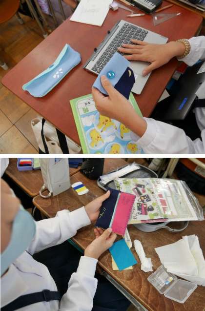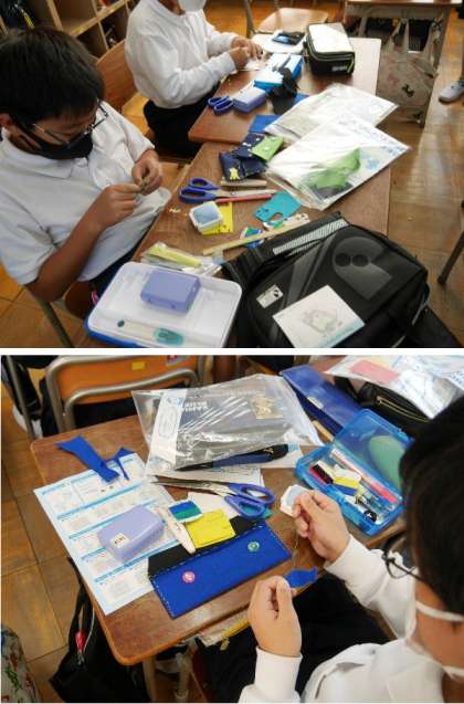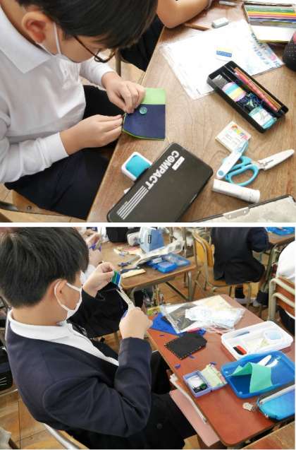 5年生がフエルト生地で小物入れを作っています。ペン入れや、小銭いれ、ティッシュ入れなどができてきました。
