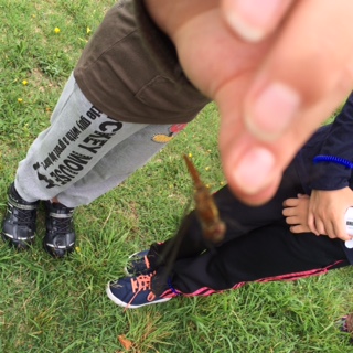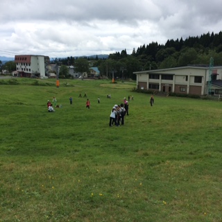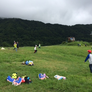 冬のスキー場のゲレンデとなる緑の斜面を駆け回っています。高原の爽やかな風の中、のびのびと自然を満喫しています。トンボも捕まえました。