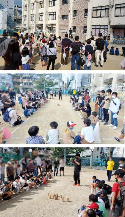 PTA主催の第1回ひがみやフェスが小学校の運動場や講堂で行われました。福井県からモルックお兄さんに来ていただき、モルックの説明をうけて、PTA寄贈のモルックで楽しみました。キッチンカーも2台きていて並んでいます。講堂ではスマートボールや綿菓子もあり、秋深まりゆく季節にとてもいいイベントとなっています。