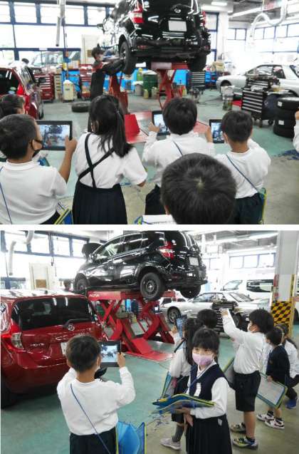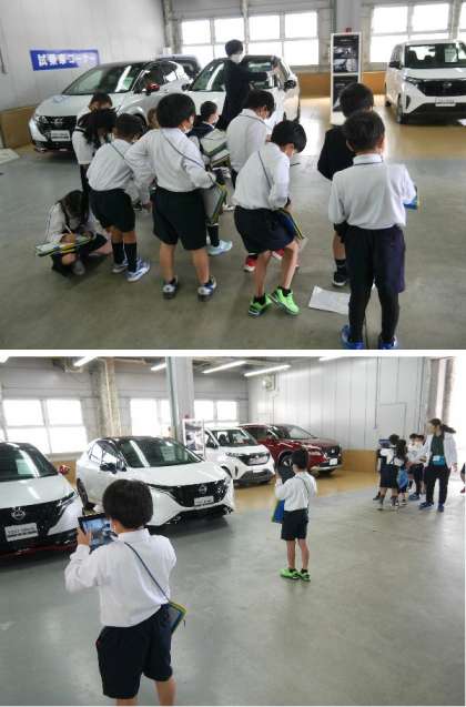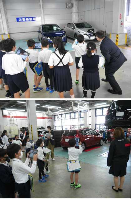 2年生では、まち探検として、校区内の店などを訪問して調べる予定です。今日は、学校の横の日産自動車販売整備所に出かけて、2年生がお話を聞いたり見学しました。タブレットで写真もたくさん撮りました。