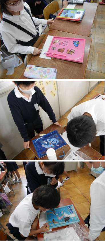 4年生の図工では、玉をころがすゲームを木やクギを打って作ってきました。今日は完成したゲームを皆で順番に楽しみました。お互いの作品を体験して感想を書いています。