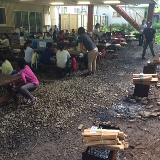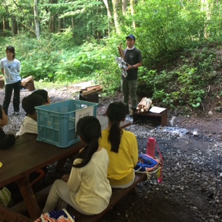 今から、今日の夕食のカレーを作ります。説明を聞いてから、まず班で協力して、野菜の皮を剥いたり小さく切ったりします。また、火おこしも協力して自分たちの力で行います。どんなカレーができるか楽しみです。