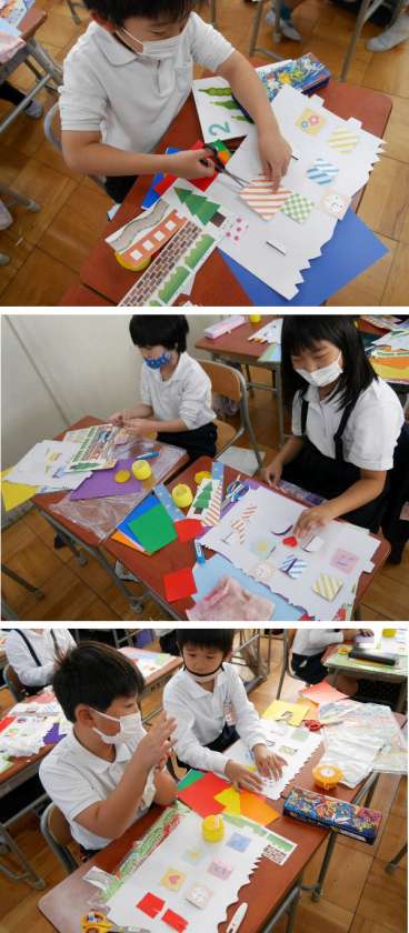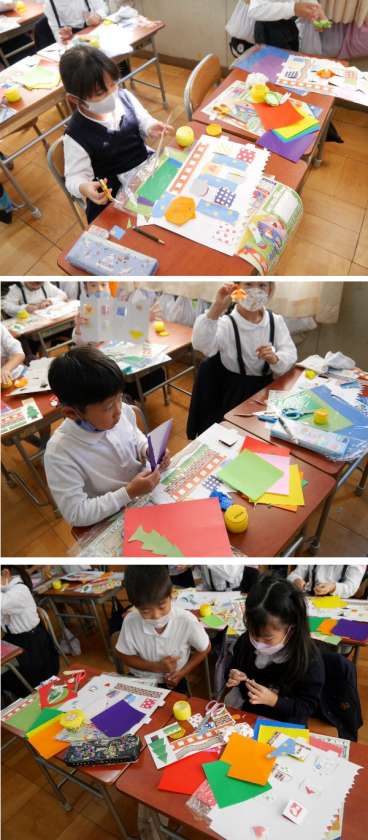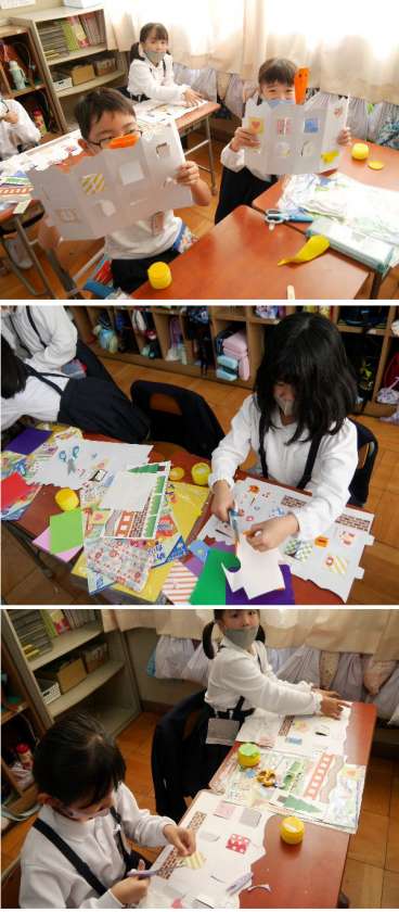 2年生では、カッターナイフを使っての作品づくりです。先日は、窓のとびらをカッターナイフで作りました。今日はその建物に飾りをつけて完成させていきます。色とりどりでとてもきれいにできあがってきましたね。
