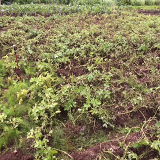 サンダイフクのオーナーさんから自然についてのお話を聞いています。その後、ジャガイモの掘り方を教えていただきました。一人で2〜3株を担当します。しっかり掘って、たくさんのジャガイモを掘り出そう。