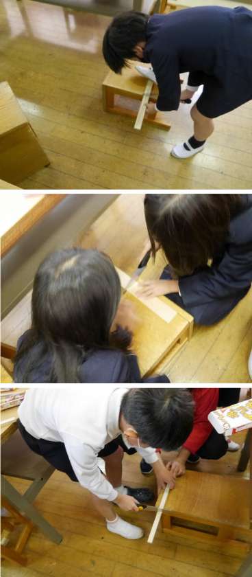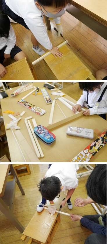 3年生の図工では、木材を使った作品づくりをしています。寸法をきめて、のこぎりを使って切っています。