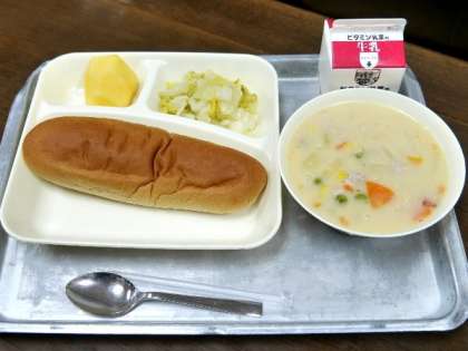 今日の献立は、豆乳コーンクリームシチュー(米粉)、ハクサイのピクルス、柿、黒糖パン、牛乳でした。