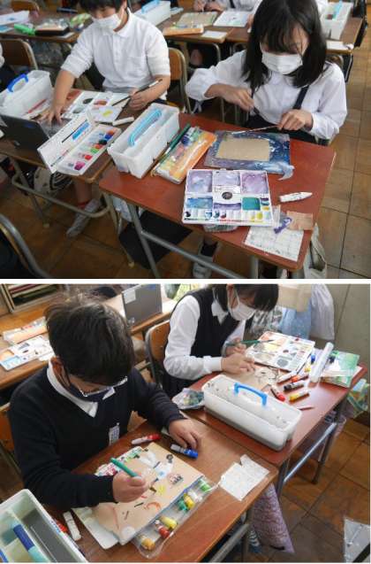 5年生では、メッセージボードづくりをしています。ボードを切り取って、色をつけているところです。