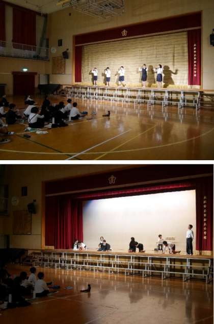 5年生は、劇をします。音楽や照明にあわせて、大きな声をだしてがんばっていました。