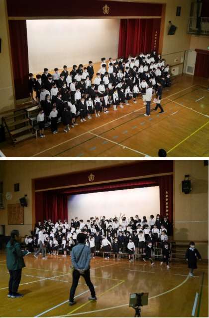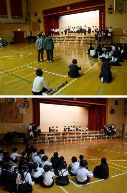 2年生が、学習発表会の舞台で練習しています。立ち位置を確認したり、流れを練習していました。