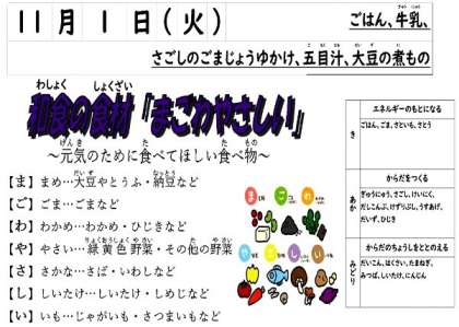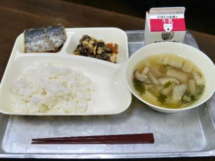 今日の献立は、さごしのごまじょうゆかけ、五目汁、大豆の煮もの、ごはん、牛乳でした。