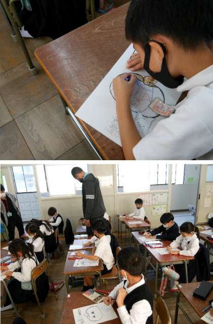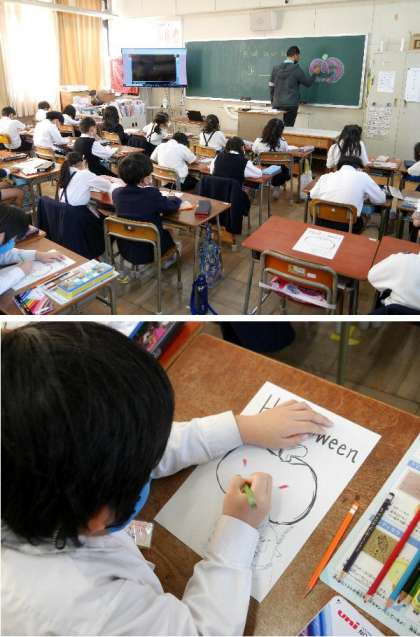 1年生の英語の授業にクリス先生がきてくれました。今日はね「What color is it?」何色がテーマ。ハロウィーンのジャック・オー・ランタンの絵に色をぬっていました。