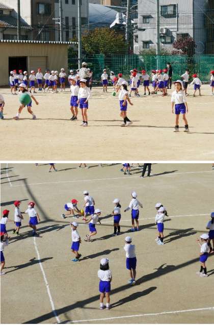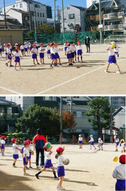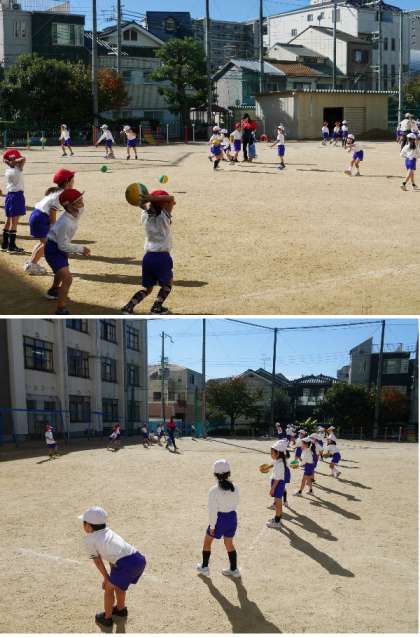 1年生では、ボールをつかったゲームをしています。ボールを投げる練習をして、ゲームのルールを知って、みんなでゲームを楽しみます。