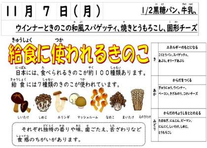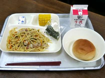 今日の献立は、ウインナーときのこの和風スパゲッティ、焼きとうもろこし、固形チーズ、黒糖パン、牛乳でした。