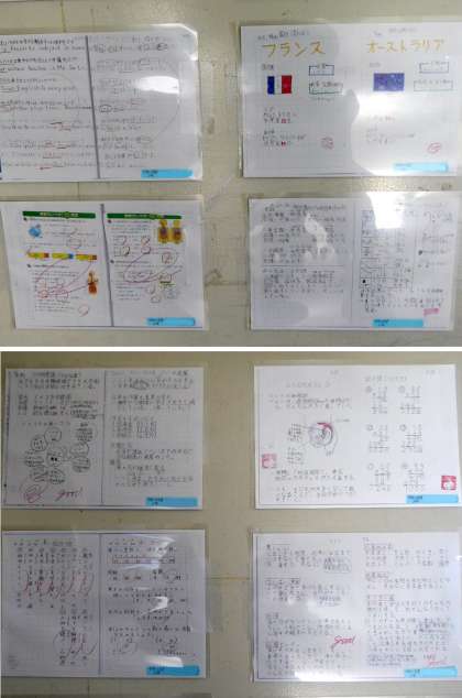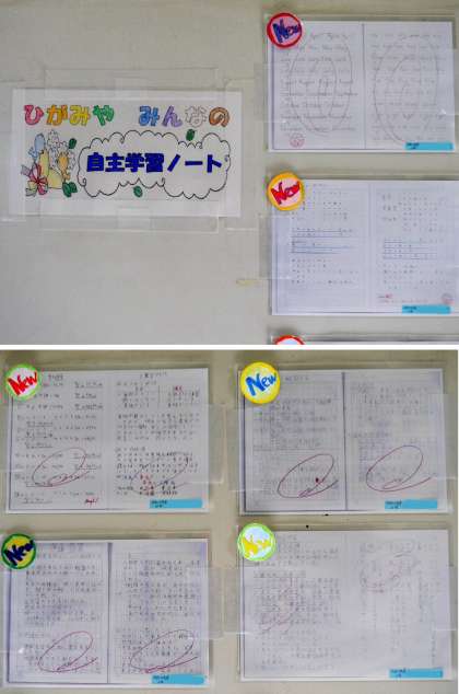 自主学習ノートに、自分で学習した内容をまとめている児童が増えてきました。自分で学習すると、とてもよく身に付きますね。がんばっている見本が、階段に展示されています。参考にしてみてください。