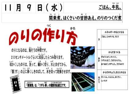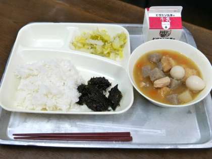 今日の献立は、関東煮、はくさいの甘酢あえ、のりのつくだ煮、ごはん、牛乳でした。