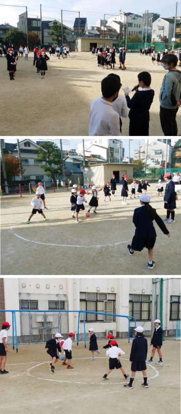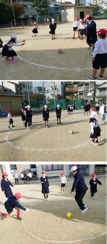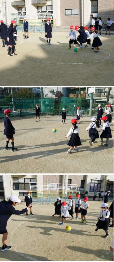 6年生がやさしく教えてくれて、「ころがしドッヂ」をしました。ルールをおぼえた1年生がとても楽しそうにしていました。