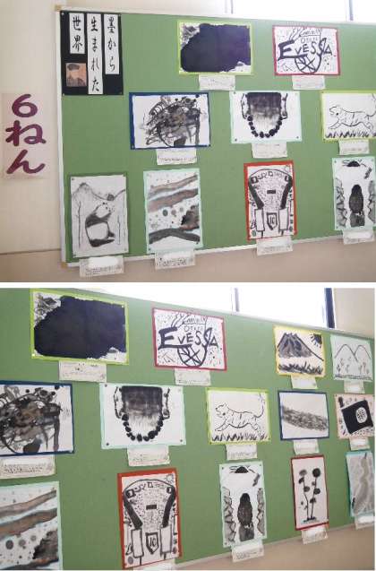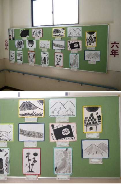 6年生の掲示板に、墨で描いた作品が展示されました。