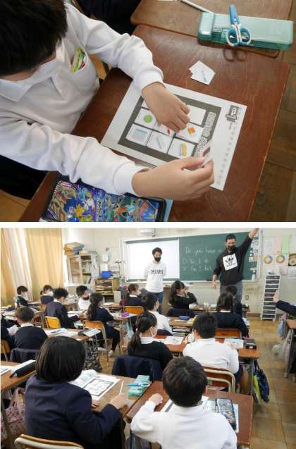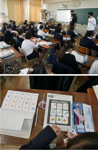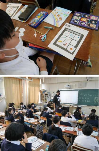 4年生の授業にクリス先生が来てくれました。ビンゴシートを使って、文房具のカードでビンゴゲームをしていました。