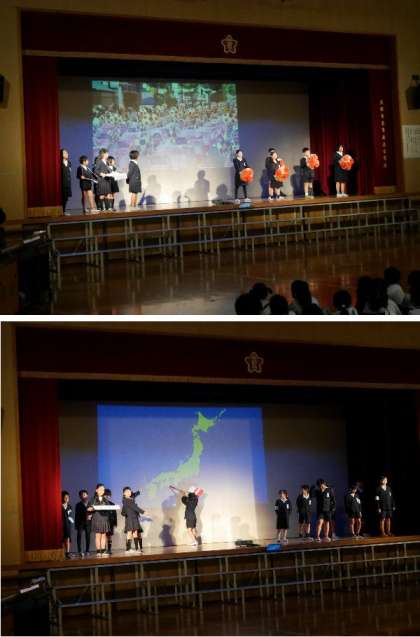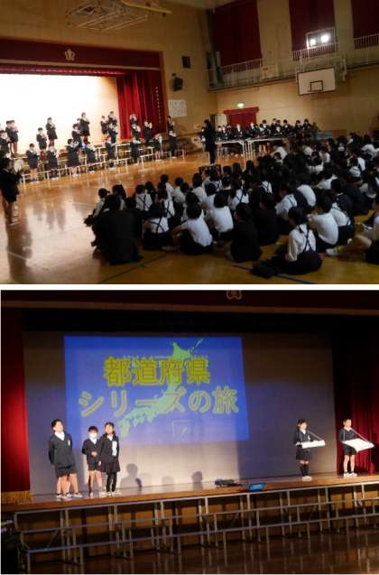 4年生の学習発表会は、銀河鉄道999の合奏から始まり、都道府県の旅と題して、これまで学習してきた調べ学習を発表しました。最後には、「ロックンロール県庁所在地」の歌を歌いました。