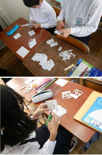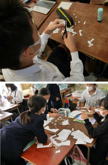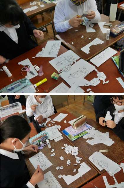 5年生の社会では、自動車工場のしくみについて学習しています。それを体験するために、厚紙で自動車の部品を切り抜く人と、部品をもらってきて自動車の土台に貼り付けて自動車を組み立てる人に分かれて作業をしました。