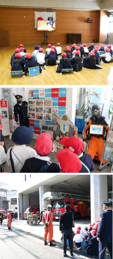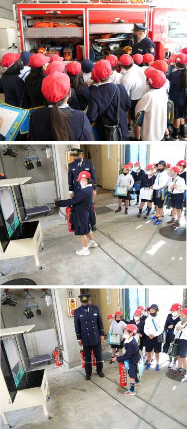 3年生が、都島消防署まででかけて見学させていただきました。最初に火の怖さのアニメをみてから、ちょうど行われていた消防訓練の試験の様子をみました。いろいろな消防車をみて説明していただき質問もたくさんしていました。最後に、消火器の練習をしました。
