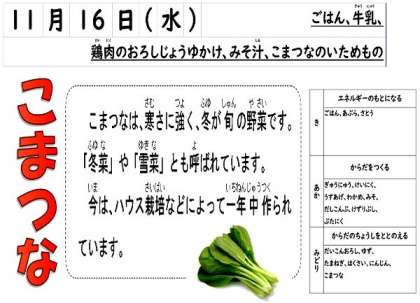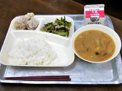 今日の献立は、鶏肉のおろしじょうゆかけ、みそ汁、こまつなのいためもの、ごはん、牛乳でした。