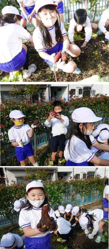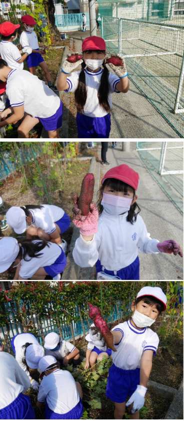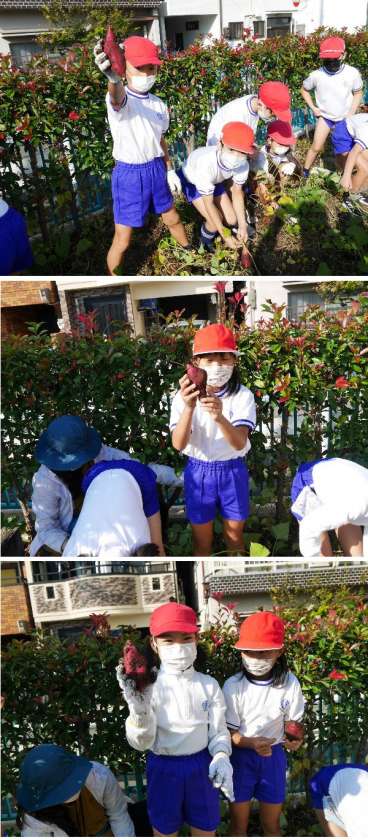 2年生は、学校の学級園で育ててきたサツマイモを収穫しました。大きなサツマイモを収穫して、とてもうれしそうです。