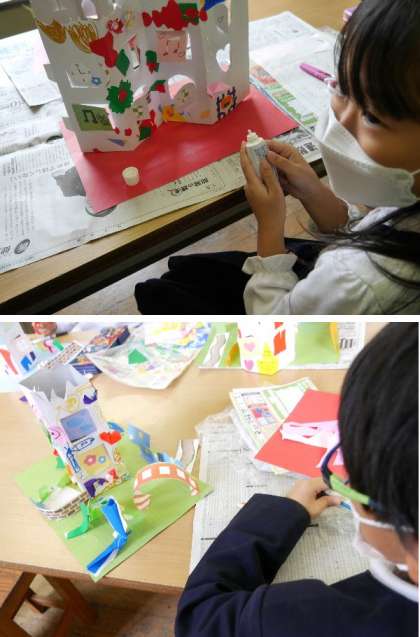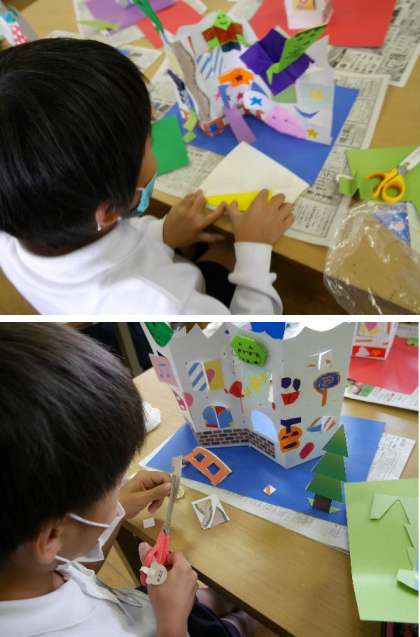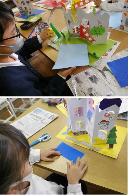 2年生が、図工室で窓のある建物を台紙にはって完成させていました。はしごをつけたり、楽しくしあげていました。
