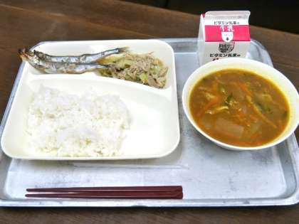 今日の献立は、焼きししゃも、和風カレー汁、まいたけとキャベツの炒め物、ごはん、牛乳でした。