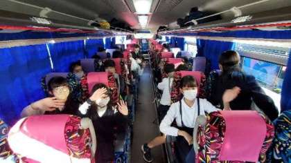 みんな元気です。バスではみんなの好きな音楽CDをかけて楽しんでます。