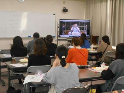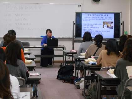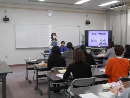 給食の試食後は、児童の給食委員会が作った「マナークイズ」の動画を見ていただき、その後は栄養教諭から、給食についての講話を行いました。給食について食材や調理、献立、安全管理などについて説明がありましたが、皆さんとても集中してお話をお聞きくださり、メモを取りながら聞かれている方もいました。