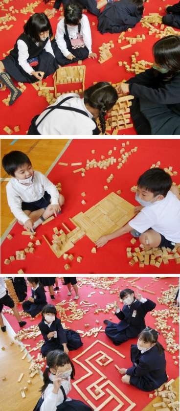 1年生が体育館で、積み木遊びをしています。ともだちと協力して、いろいろな形や大きな作品もできあがってきましたね。すごいです。子どもたちの発想の豊かさに関心させられます。